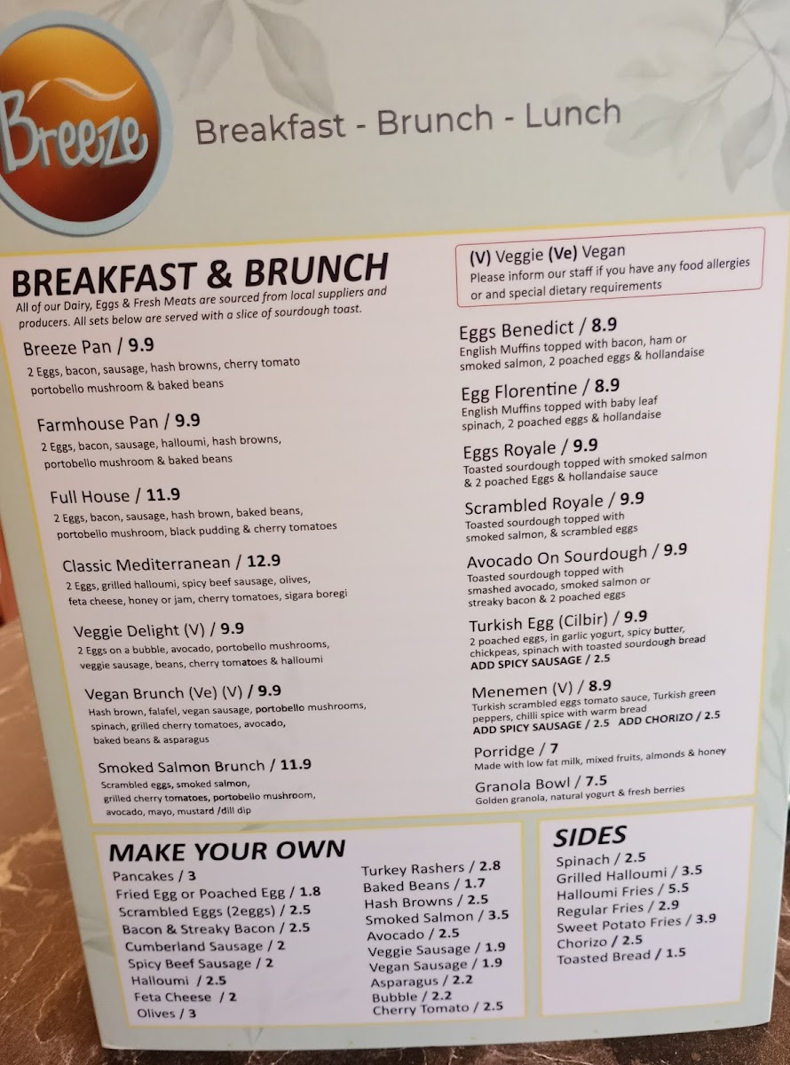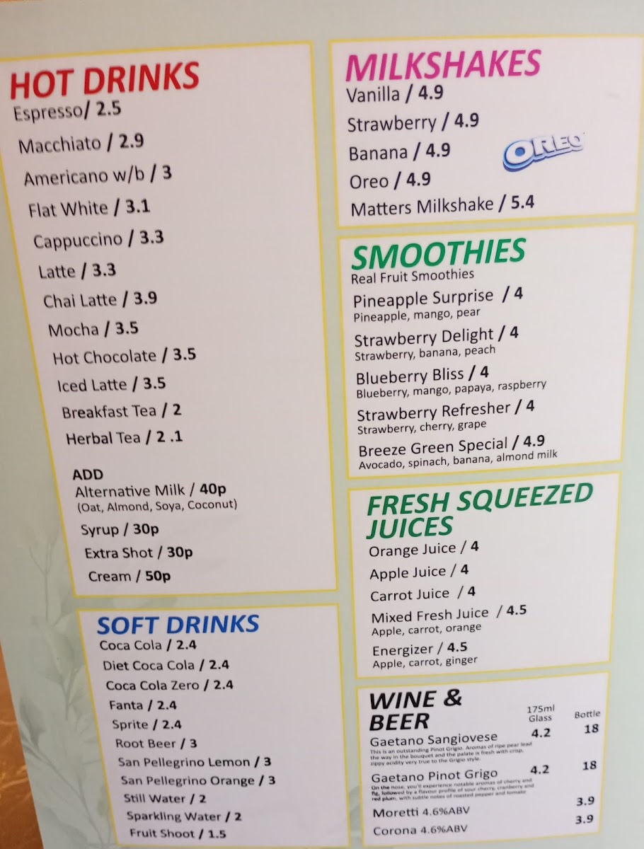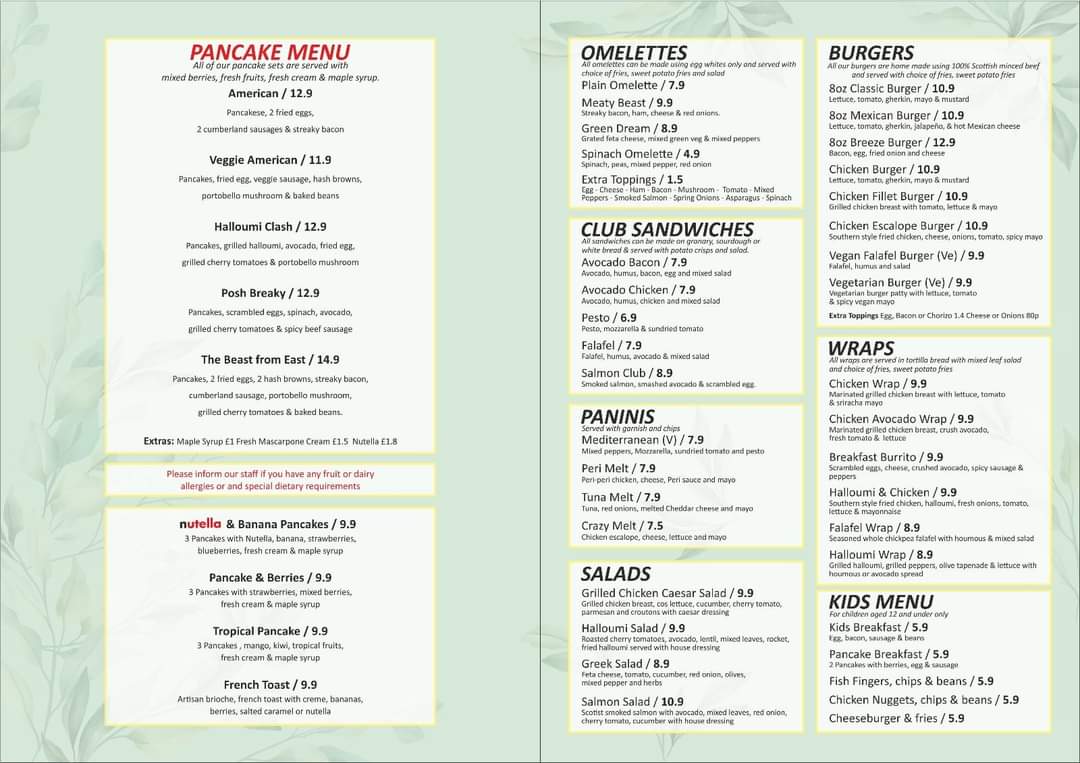From a reviewer’s perspective, the menu at Breeze Witham offers an impressively broad and well-balanced selection that caters to almost every taste, making it an ideal all-day dining spot in the heart of Witham. The Club Sandwiches such as Avocado Bacon, Avocado Chicken, Pesto Falafel, and Salmon Club feel thoughtfully crafted, offering both classic comfort and lighter, modern options. This same balance carries through to the Paninis, including Mediterranean, Peri Melt, Tuna Melt, and Crazy Melt, which are perfect for a satisfying lunch. For those seeking something fresher, the salad range-Grilled Chicken Caesar Salad, Halloumi Salad, Greek Salad, and Salmon Salad-adds a healthy yet flavourful dimension to the menu. The Wraps section, featuring Chicken Wrap, Chicken Avocado Wrap, Breakfast Burrito Halloumi & Chicken, and Falafel Wrap, continues this theme of variety and flexibility. Families are clearly well considered with a dedicated Kids Menu, including Kids Breakfast, Pancake Breakfast, Fish Fingers, Chips & Beans, Chicken Nuggets, Chips & Beans, and Cheeseburger & Fries. Breakfast lovers will appreciate the extensive Pancake Menu-from American and Veggie American to Halloumi Clash, Posh Breaky, and The Beast From East-as well as hearty Omelettes like Plain Omelette, Meaty Beast, Green Dream Spinach Omelette, and filling Breakfast & Brunch dishes such as Breeze Pan, Farmhouse Pan, Full House, Classic Mediterranean, and Veggie Delight. The menu is rounded out with indulgent Burgers like 8oz Classic Burger, 8oz Mexican Burger, 8oz Breeze Burger, Chicken Burger, and Chicken Fillet Burger, alongside generous Sides including Halloumi Fries, Regular Fries, and Sweet Potato Fries. Drinks are equally well covered, from Espresso, Latte, and Cappuccino to Milkshakes like Oreo and Matters Milkshake, refreshing Smoothies such as Breeze Green Special, fresh juices like Mixed Fresh Juice and Energizer, and a concise Wine & Beer list featuring Gaetano Sangiovese, Gaetano Pinot Grigio, and Moretti Draft 4.6% Abv. Overall, Breeze Witham’s menu feels cohesive, generous, and welcoming, successfully bringing together comfort food, fresh choices, and family-friendly appeal in one place.